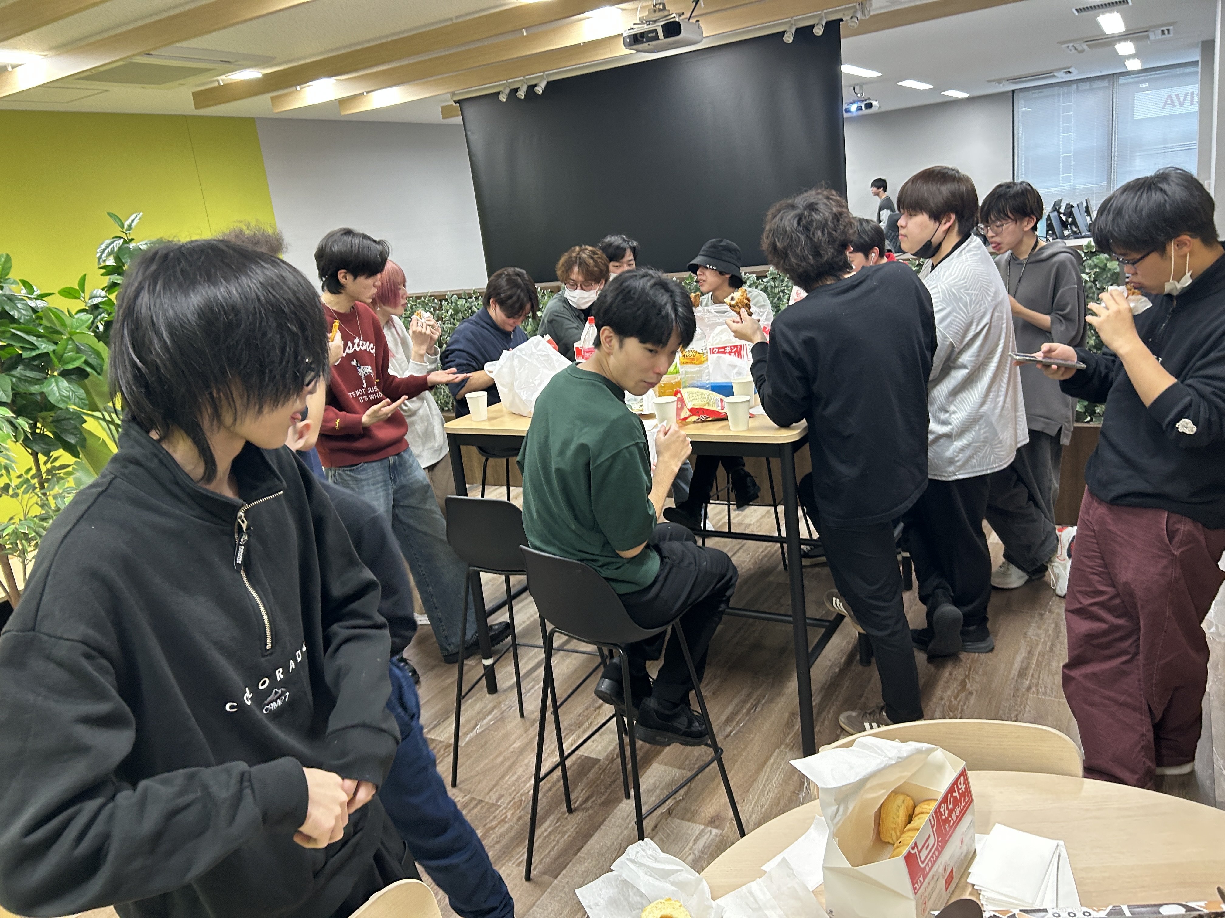 今回のクリスマス会では、普段あまり交流の機会がないFNコースとVALOコースの生徒たちが一堂に会し、ゲームを通じて楽しい時間を過ごしました。チームを組んで対戦したり、プレイを見守りながら盛り上がったりと、自然と会話が生まれ、笑顔があふれる時間となりました。また、チキンやドーナッツなどの軽食を囲みながら、ゲーム以外の話題でも交流が深まり、和やかなひとときを過ごすことができました。