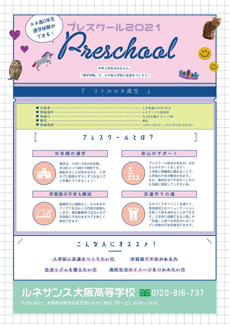 ①プレスクール当日に欠席連絡等がない場合は、生徒へ担当のルネ高教職員から連絡をさせていただきます。