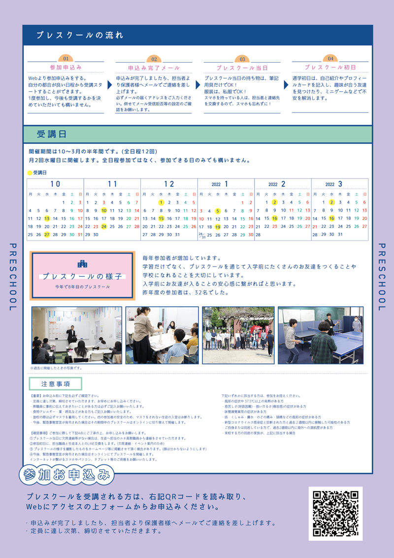 ・今後、緊急事態宣言が発令された場合はその期間中のプレスクールはオンラインに切り替えて開催します。