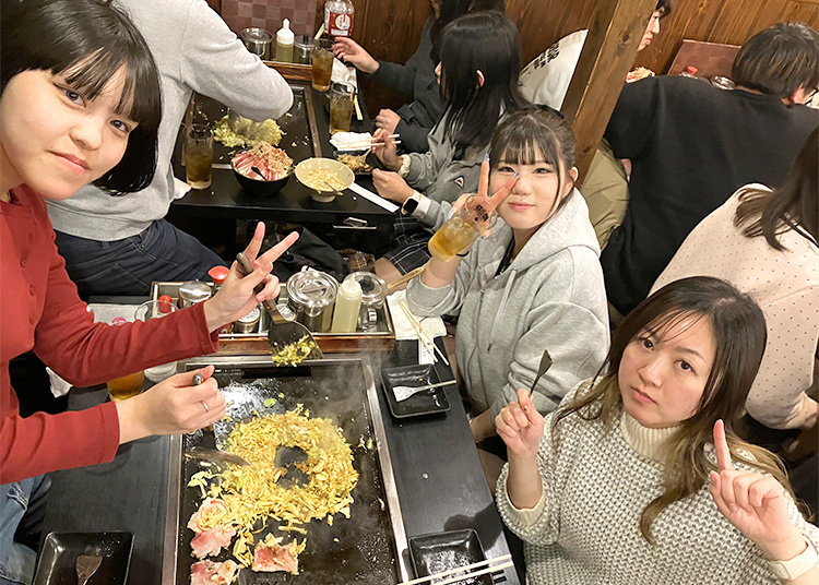 午後の浅草寺界隈では、班ごとに自由行動を実施。歴史ある街並みを背景に、おみくじで運試しをしたり、仲見世通りで食べ歩きやお土産選びを楽しんだりと、思い思いの時間を過ごしました。夕食は東京名物の「もんじゃ焼き」に挑戦。初めて作る独特の調理法に戸惑いながらも、鉄板を囲んで友人と協力しながら楽しそうに食事をする姿が印象的な、賑やかな旅の始まりとなりました。
